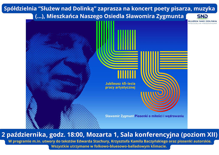 Zapraszamy na koncert Sławomira Zygmunta pt. "Piosenki o miłości i wędrowaniu", na który złożą utwory z wszystkich 10 solowych płyt artysty. Ale też jest szczególna, podwójna okazja - 45-lecie pracy artystycznej Sławomira Zygmunta i... drugi "Medal Zasłużony Kulturze Gloria Artis". Pierwszym, Brązowym, uhonorowano artystę w 2017 roku, drugim, Srebrnym w 2025.