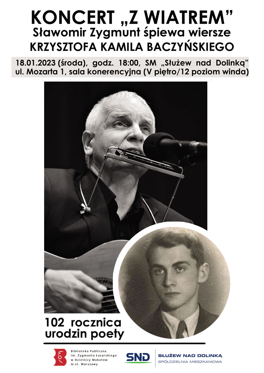 Sławomir Zygmunt (śpiew, gitara, harmonijka ustna) zaprezentuje wiersze wojennego wieszcza Krzysztofa Kamila Baczyńskiego z własną muzyką.