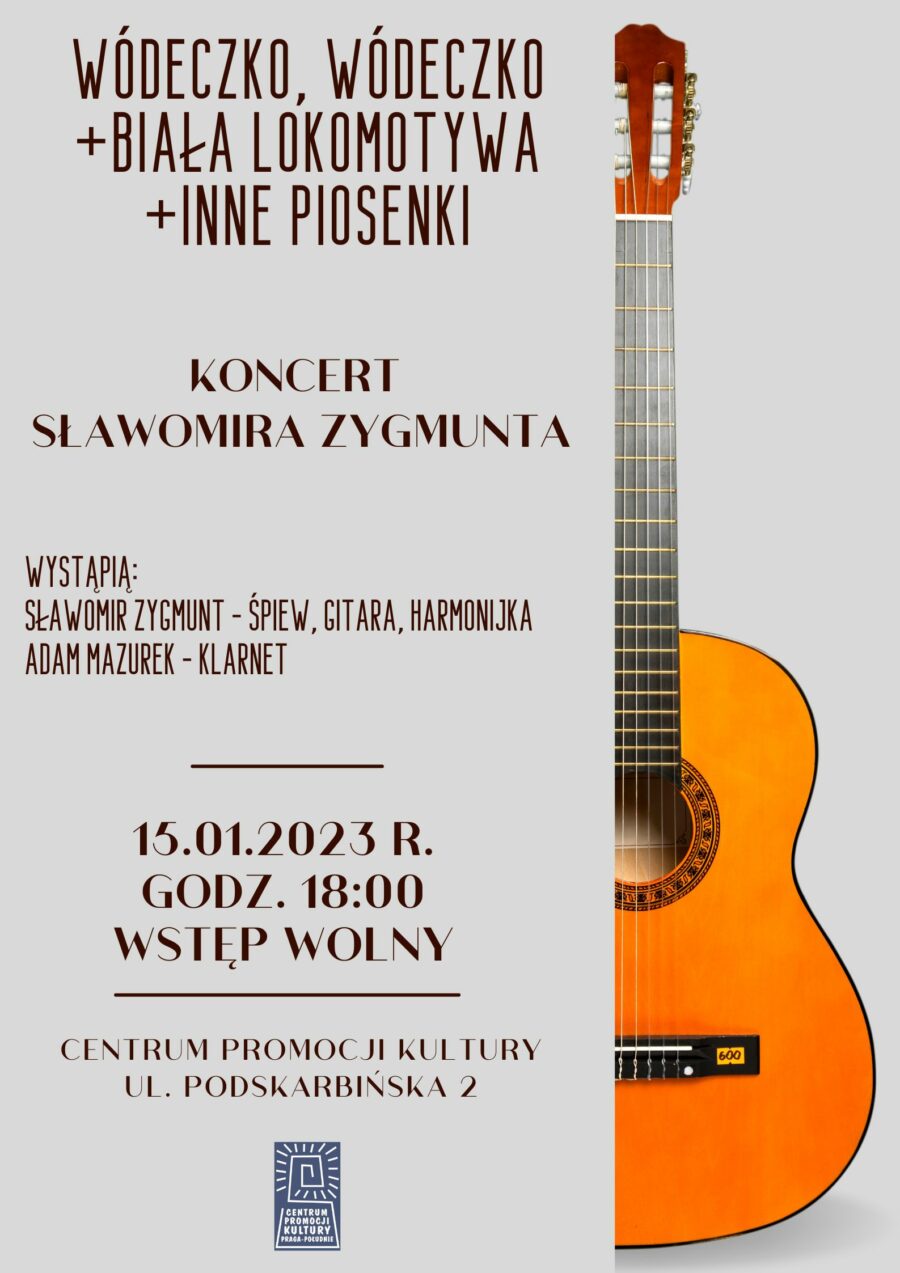 Zapraszamy na koncert Sławomira Zygmunta pt. "Wódeczko, wódeczko + Biała lokomotywa + inne piosenki". Podczas występu usłyszymy piosenki z ostatniej płyty Sławomira Zygmunta pt. "Wódeczko, wódeczko" oraz znane i lubiane utwory artysty, m.in. "Białą lokomotywę", "Na balkonie". Na scenie Sławomirowi Zygmuntowi towarzyszyć będzie Adam Mazurek, grający na klarnecie.